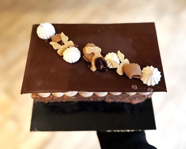 Nouvel entremet composé d’un biscuit chocolat intense, croustillant praliné et feuillantine, crémeux praliné amande/noisette, ganache montée chocolat au lait
