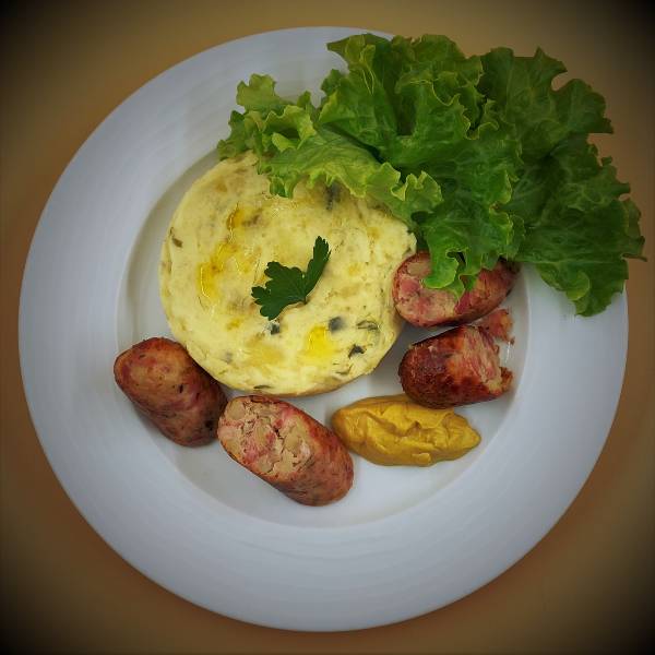 Ecrasée de pommes-de-terre aux poireaux, saucisse paysanne fumée