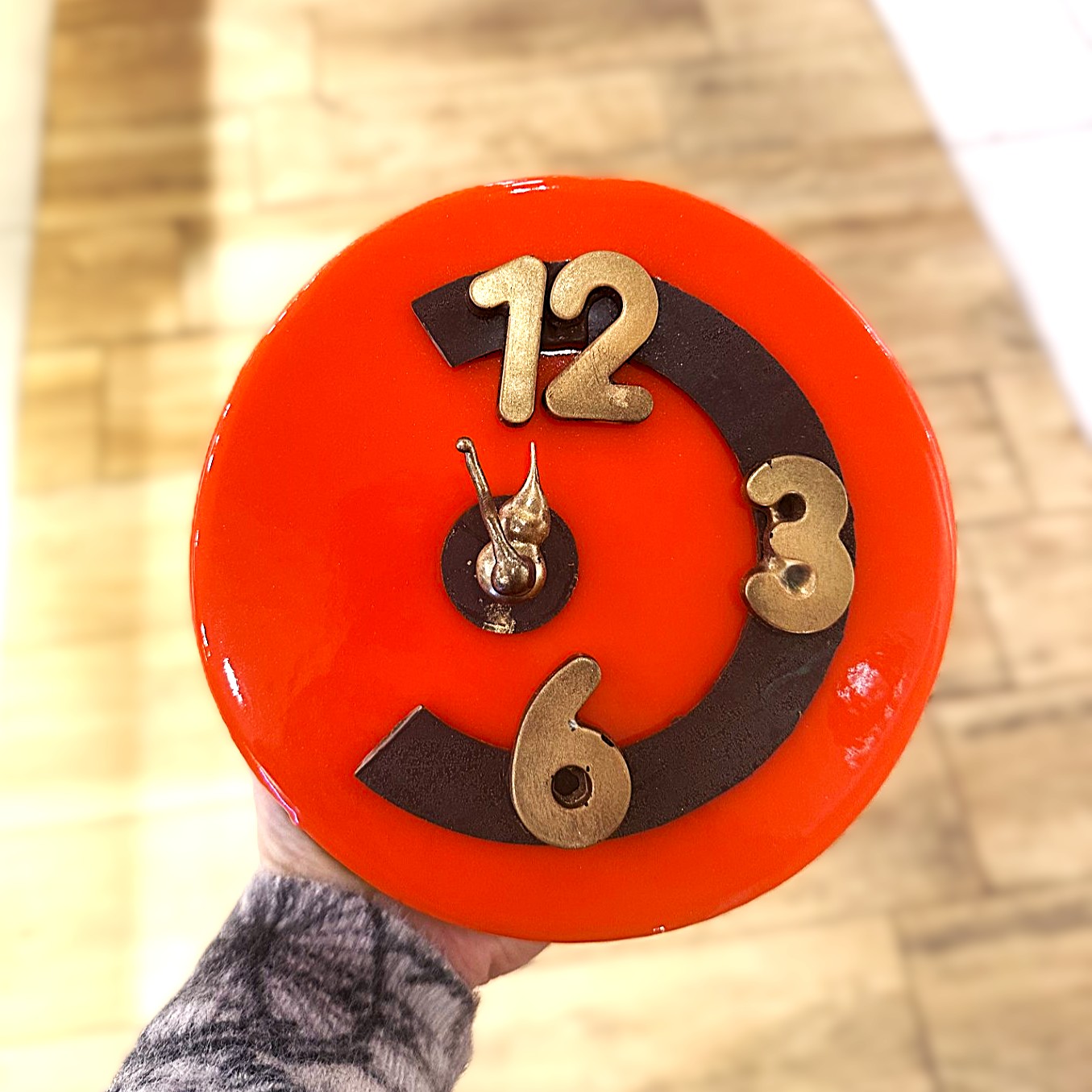 L’entremet 12 coups de minuit propose une mousse légère mais gourmande au chocolat au lait, appuyée par de l’onctueux gianduja au goût de praliné, mais nous avons choisi de rafraichir le tout avec la compotée d’abricot qui apporte cette touche lumineuse et ensoleillée, pour commencer l’année 2026 avec beaucoup d’espoir !!