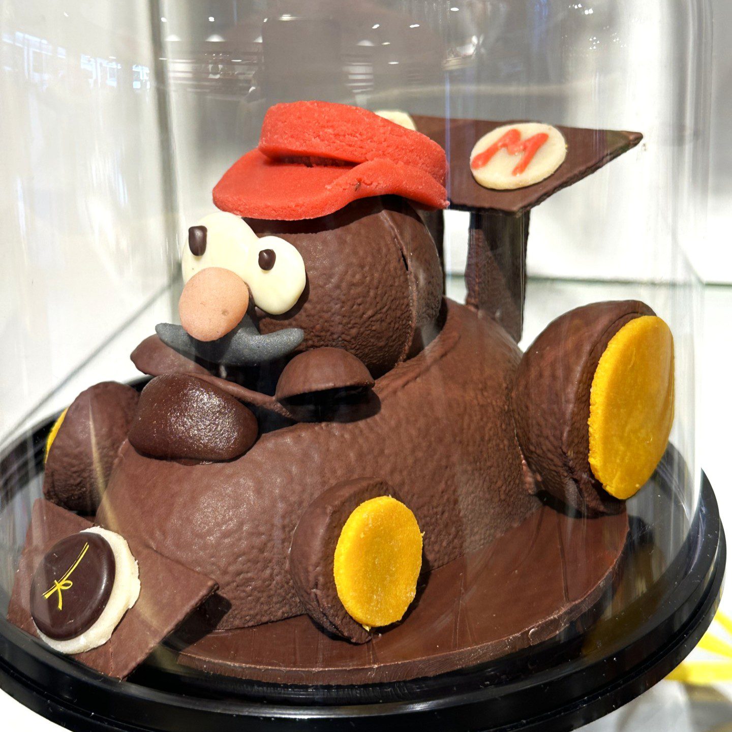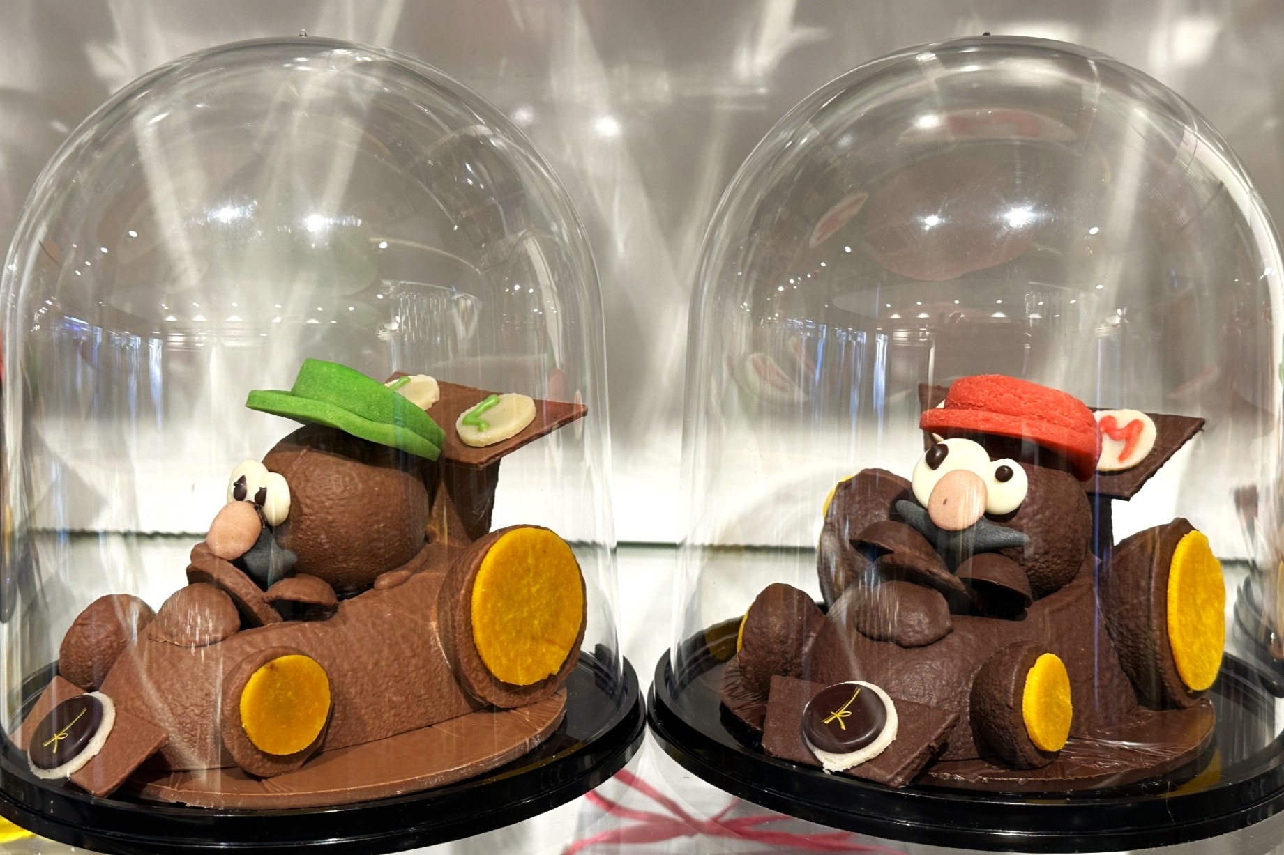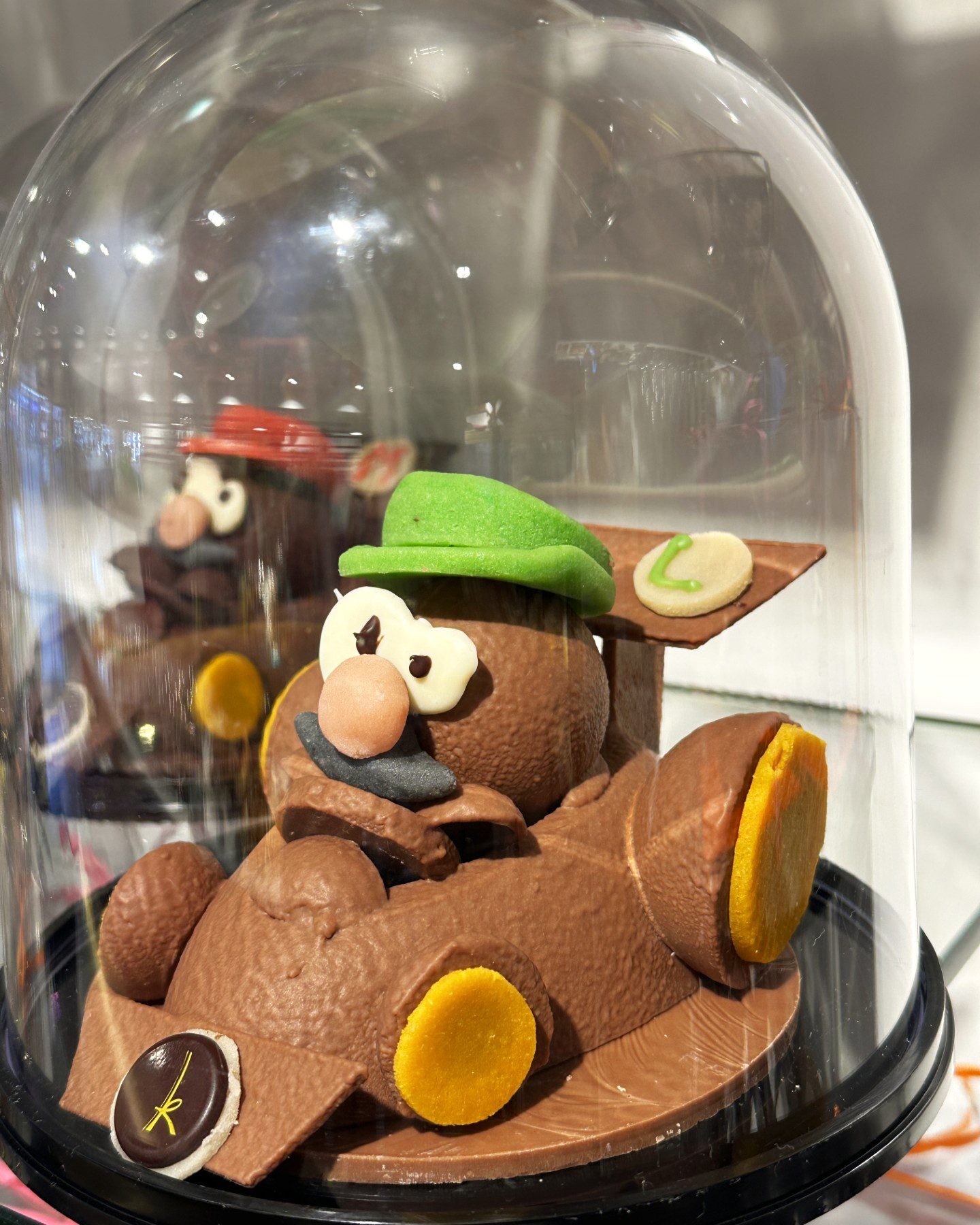 Sujet en chocolat lait ou noir représentant Mario ou Luigi en karting, décors en pâte d’amandes et chocolat blanc.